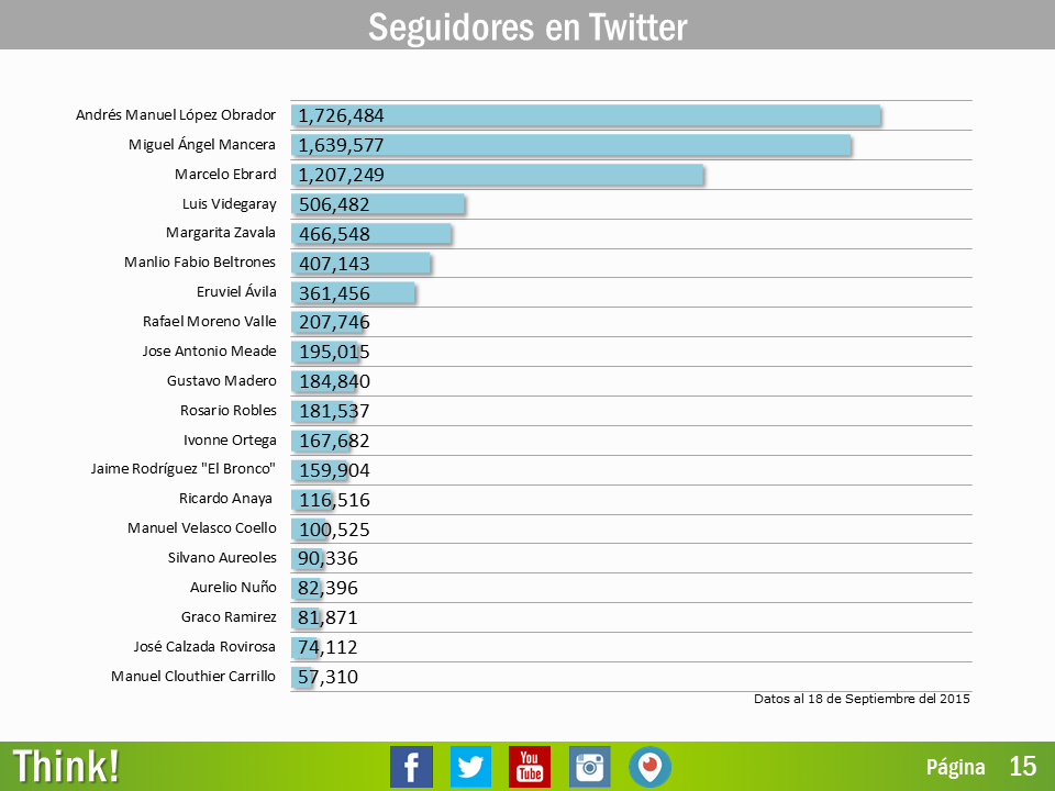 Por su parte, en Twitter el liderazgo lo tienen Andrés Manuel López Obrador, Miguel Ángel Mancera y Marcelo Ebrard, a pesar de que prácticamente no dialogan con sus seguidores. Estos son los únicos políticos aspirantes a gobernar México que cuentan con más de un millón de seguidores y que cuentan con un amplio impacto en término de alcance.