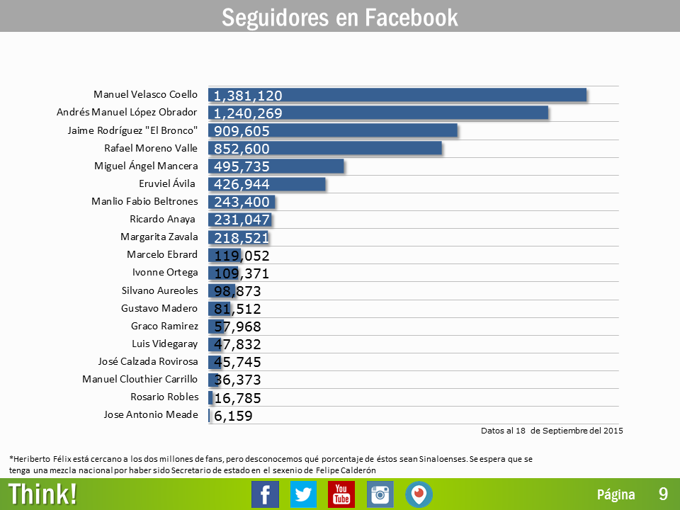 En Facebook, por ejemplo, el liderazgo lo tienen Andrés Manuel López Obrador, Manuel Velásco y Jaime Rodríguez “El Bronco” en cuanto a número de seguidores, pero “El Bronco” tiene a diferencia de los demás, un muy elevado nivel de interacción y conversación, lo que lo hace más eficiente comunicando en esa red social.